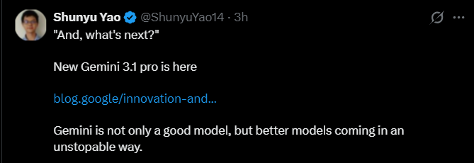 姚顺宇的 “更好模型在路上” 预告,暗示谷歌正加速大模型迭代节奏。Gemini 3.1 Pro 的发布不仅重塑了 AI 性能格局,更以 “高性能 + 低成本 + 全生态” 的组合拳,为开发者、企业用户提供了更可靠的智能底座,推动 AI 从 “能做事” 向 “做好事” 跨越。