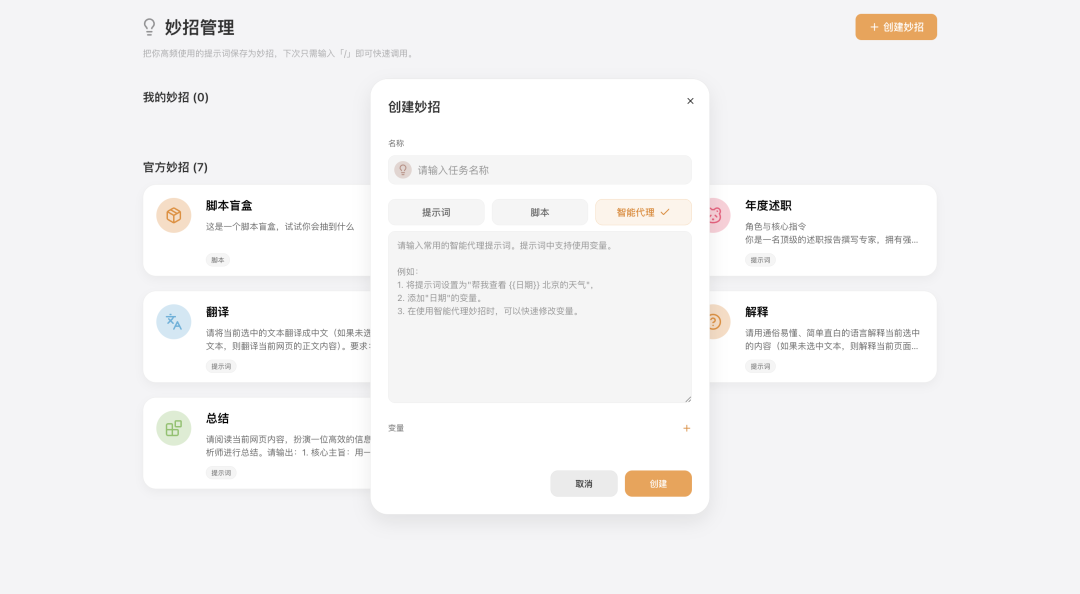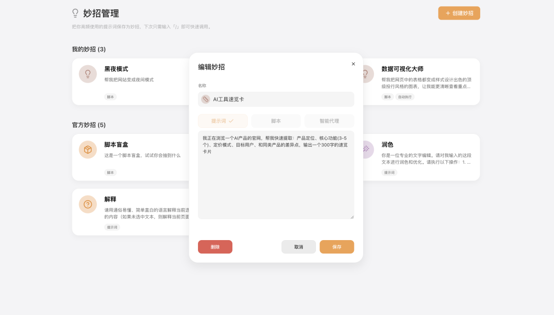 - 提示词妙招:保存常用提示词,一键复用。比如创建 “AI 工具速览卡”,Prompt 设置为 “提取产品定位、核心功能、定价、目标用户,输出 300 字速览”,以后读任何 AI 产品介绍,一键就能按自己的规格抓重点,不用反复写提示词;