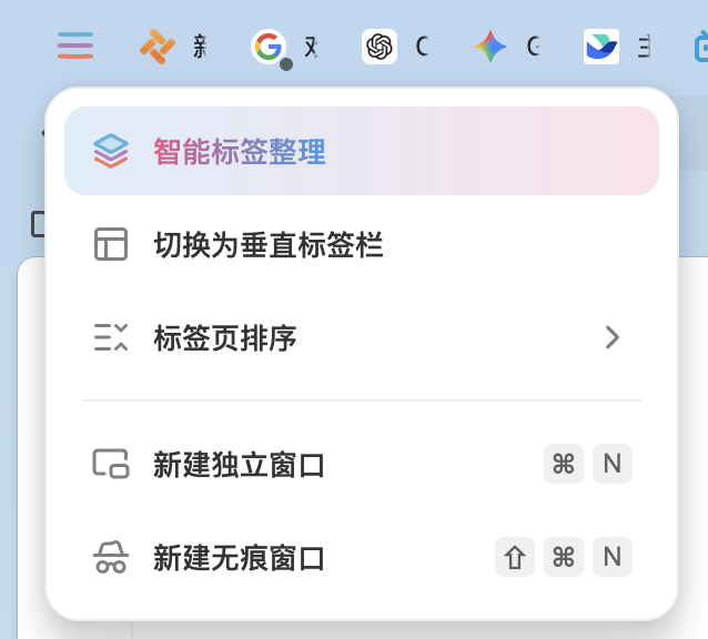 智能自动分组:点击 “智能标签整理”,几秒钟就能把混乱的标签页按主题分类,实测三十多个标签被自动分成 “AI 对话助手”“新闻评审工具”“云文档协作” 等 8 个组,分组准确度远超预期;