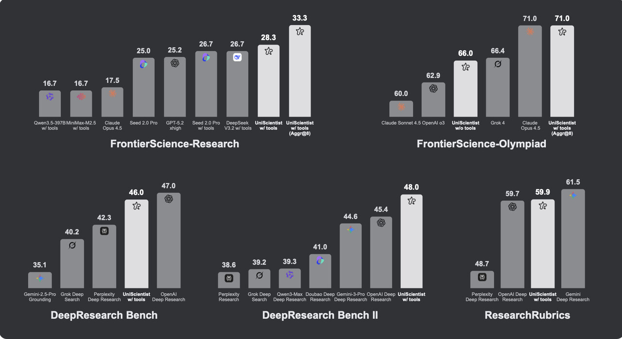 | 评测基准 | UniScientist 得分 | 对比模型 | 对比模型得分 |
