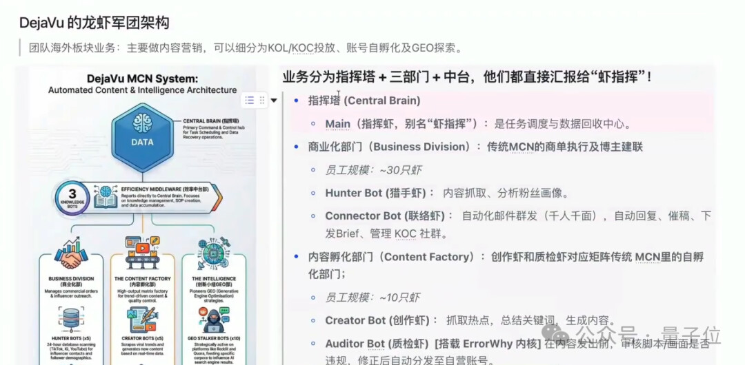 商业化部门:30 只虾,含 “猎手虾”(内容抓取、粉丝画像分析)和 “联络虾”(千人千面邮件群发、催稿、KOC 社群管理);