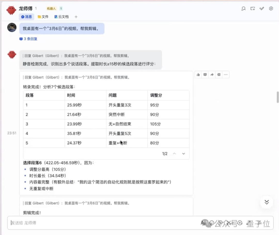 创作者 Gilbert 仅需告知龙虾 “桌面有个‘3 月 6 日’的视频,帮我剪辑”,智能体便自动完成全流程操作:先进行静音检测,砍掉无声音的废镜头;再转录语音内容,筛选出 7 个有效说话段落;最后根据 “无重复、内容完整、时长适配” 三大标准评分,选中调整分 105 分的最优段落,将 9 分钟原视频精剪为 39 秒的精华版。面对多段素材,它还能自动提取最佳片段并完成拼接,让博主、自媒体人彻底摆脱繁琐的初剪工作。