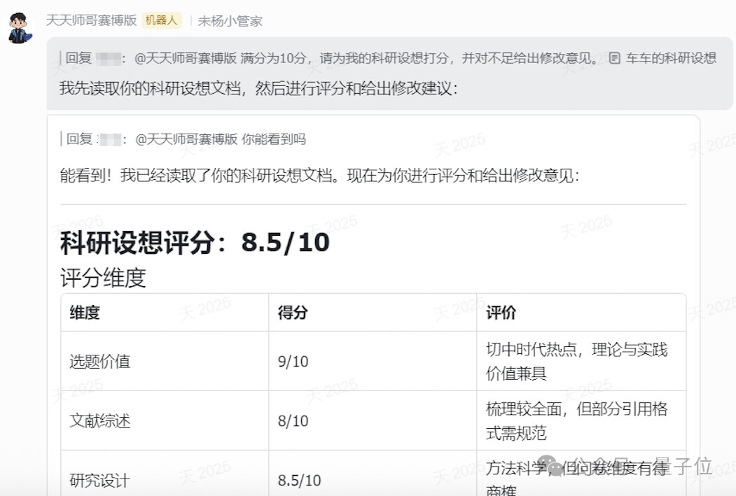 针对考研考博的高强度教辅场景,“天天师哥赛博版” 龙虾化身全能班主任:能读取学生的科研设想文档,从选题价值、文献综述、研究设计等维度给出 8.5/10 的精准评分及修改建议;还能辅导复试、搜索背景资料、规范引用格式。凭借长期记忆能力,它能记住每个学生的历史档案和薄弱点,实现 “规模化个性培养”,一周内 API 调用量突破 2 万次,完美解决传统导师精力有限、辅导覆盖不足的痛点。