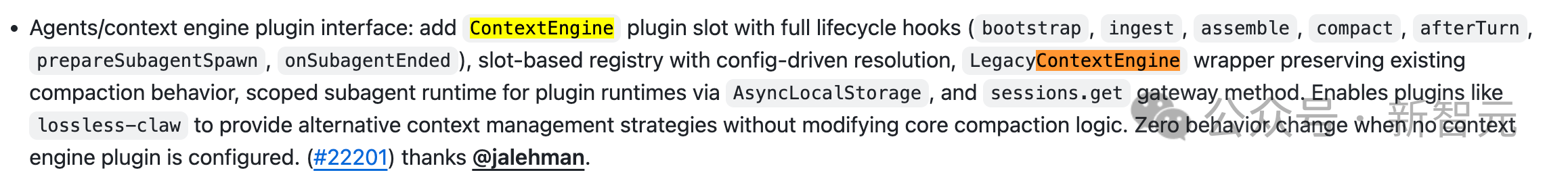这是本次更新最硬核的技术突破,彻底解决了 AI Agent 开发中最棘手的上下文管理问题。此前,上下文压缩、存储逻辑硬编码在核心代码中,修改调整需承担高风险,而新推出的 ContextEngine 插件接口,开放了全生命周期钩子: