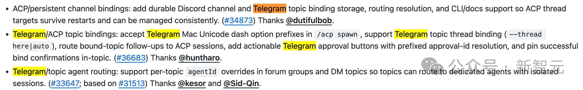 Telegram 端:新增主题级别(Topic)智能体路由隔离,同一群组的不同主题可运行独立 AI 智能体,会话互不干扰;支持话题线程绑定(–thread here|auto),绑定信息持久化存储,重启后自动恢复,彻底解决历史绑定丢失问题。